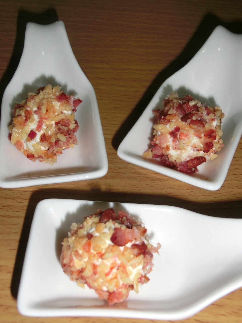 Feimos el bacon, tiene que quedar muy crujiente. En una batidora picamos el bacon y las almendras. Hacemos bolitas con el queso philadelphia y rebozamos por el bacon y las almendras y... LISTO PARA CENAR¡¡