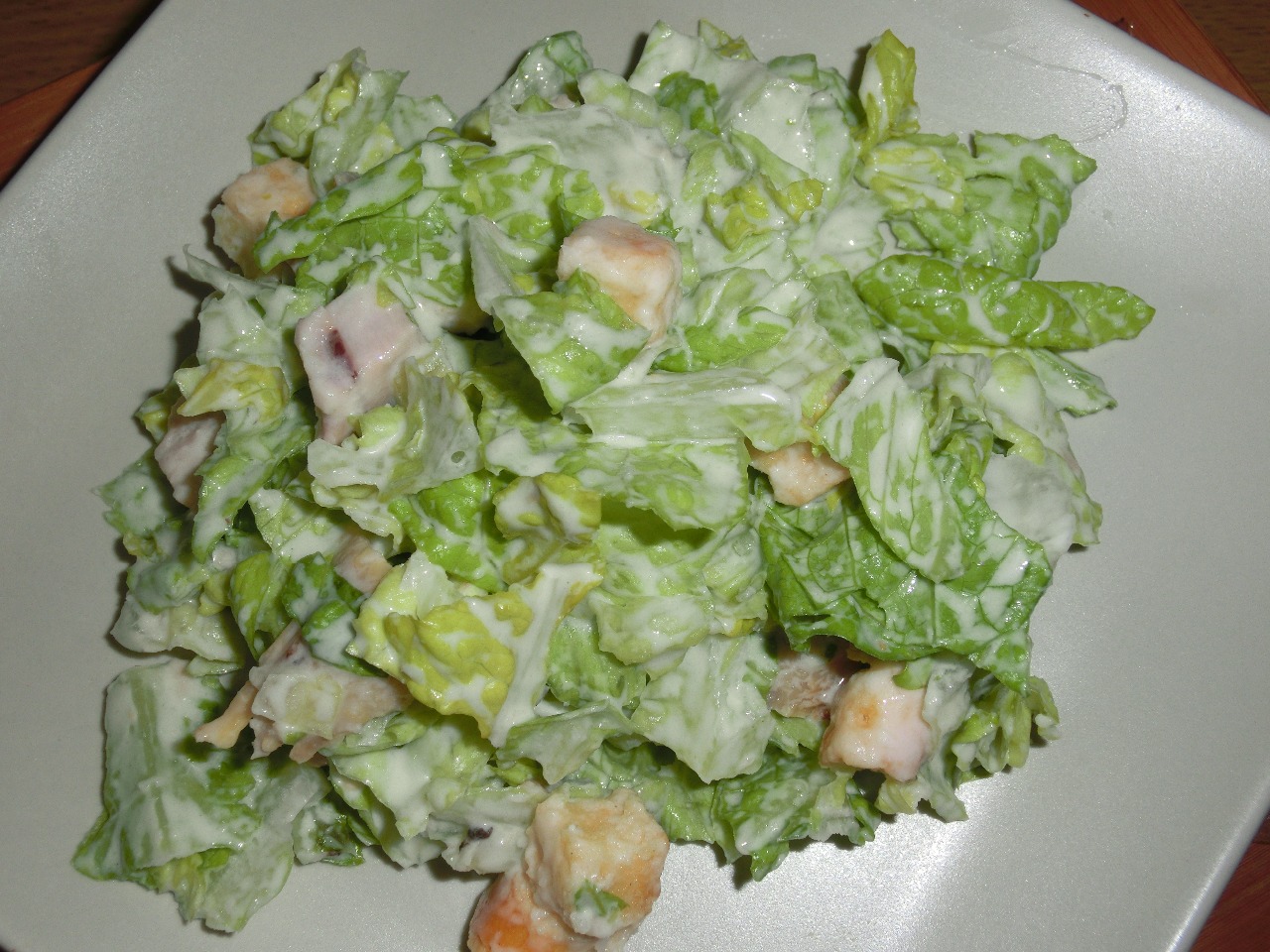 cortamos la lechuga, echamos los picatostes (en caso de no tener, cortar trocos pequeños de pan y freirlos en la sarten unos minutos), el pollo troceado, añadir la ensalada césar y el queso parmesano (puede ser rallado o en lascas) y....LISTO PARA CENAR¡¡¡