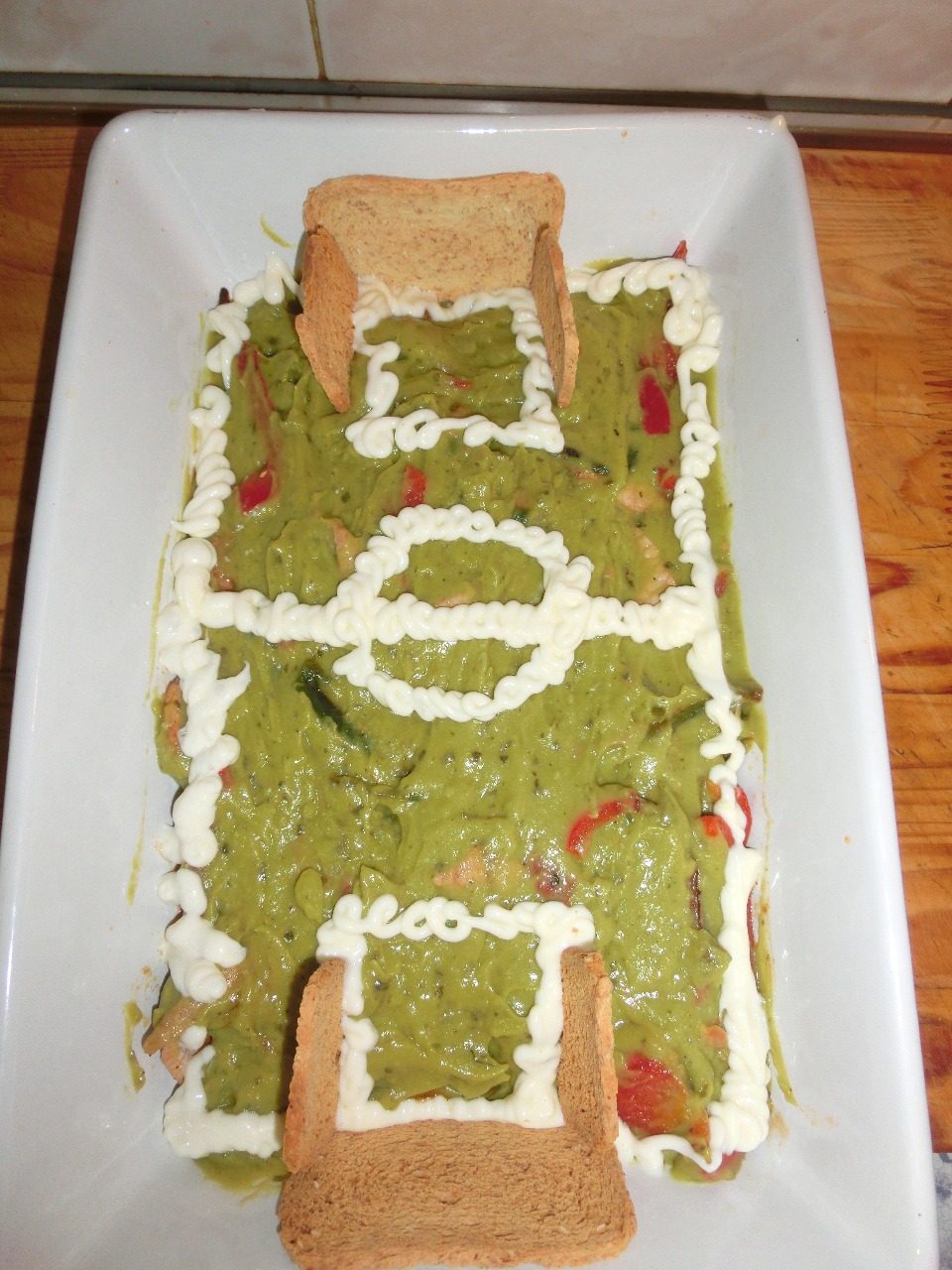 campo de futbol hecho a base de los tipicos tacos mexicanos de pimiento, guacamole, pollo, etc.. (ver receta en carne, tacos mexicanos)