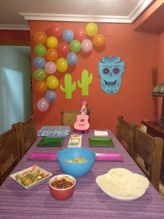 Este cumpleaños tenía temática mexicana y para eso preparamos unos nachos con chili y queso fundido y unos tacos de pollo con salsa picante y guacamole