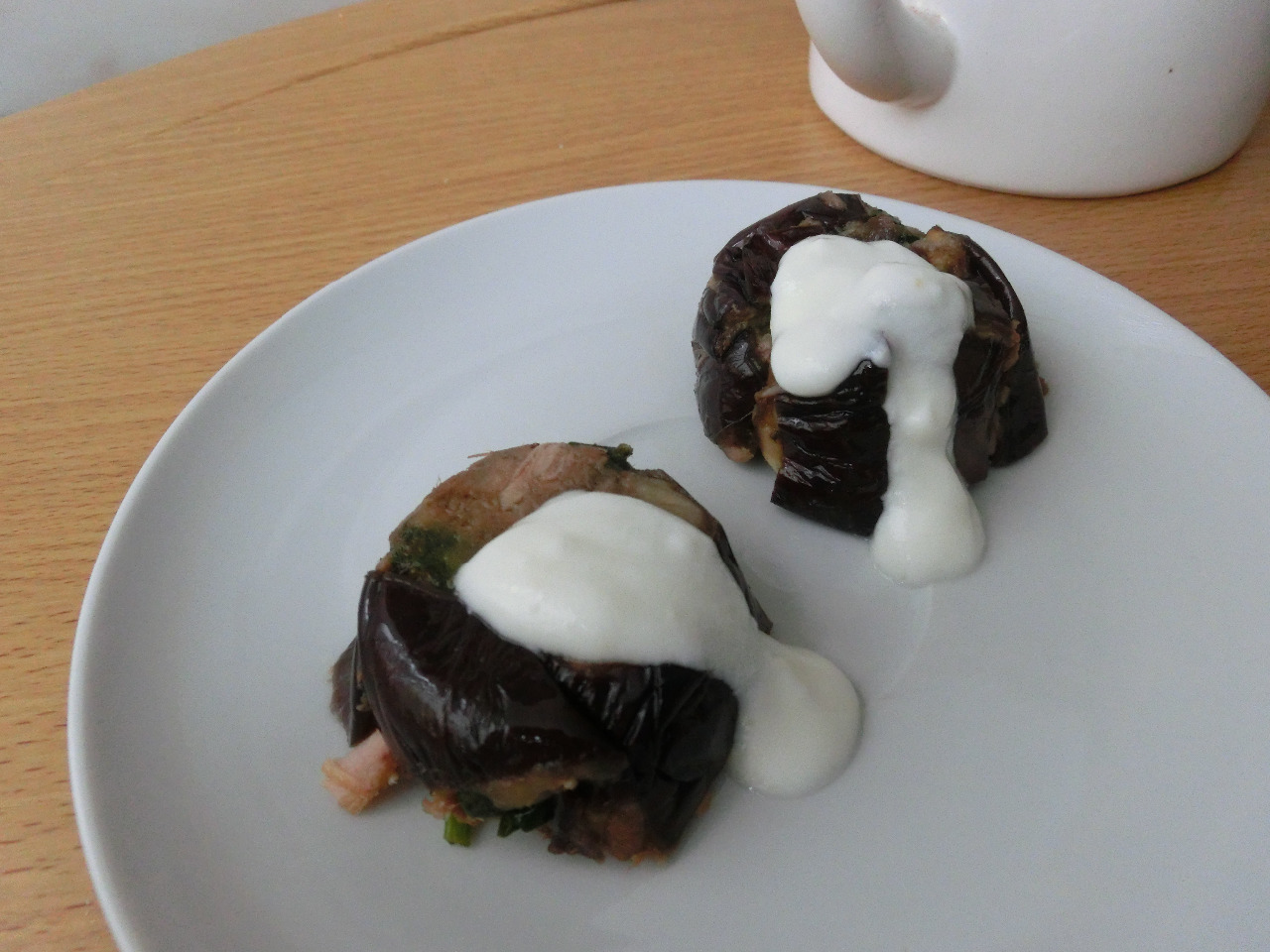 Ponemos la berenjena en un bol apto para microondas y lo tapamos con papel film, le damos 4 vueltas al bol y metemos a máxima potencia en el micro sobre 15 minutos. cuando esté frio abrimos y picamos la berenjena en trozos medianos. En una sartén ponemos el aceite del atún y un ajo picado, incorporamos el atún, los trozos de berenjena y las espinacas, salamos y dejamos que temple un poco. En los recipientes de silicona para hacer magdalenas vamos poniendo los trozos de berenjena para que al darle la vuelta sea lo que se vea y cubrimos con la mezcla que tenemos en la sartén, metemos en el frigo para que enfrie un poco y podamos desmoldar sin romper. Para acompañarlo vamos a poner una salda de yoghuur mezclado con zumo de limón por encima y.........LISTO PARA CENAR!!